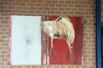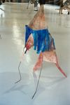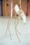 2004grote vlerk (ong 3m hoog) in metaal en papier bewerkt met acrylaten en zes dunne transparante schilderijen van 1m bij 4,5m die vrij in de ruimte kunnen hangen, samen of afzonderlijk